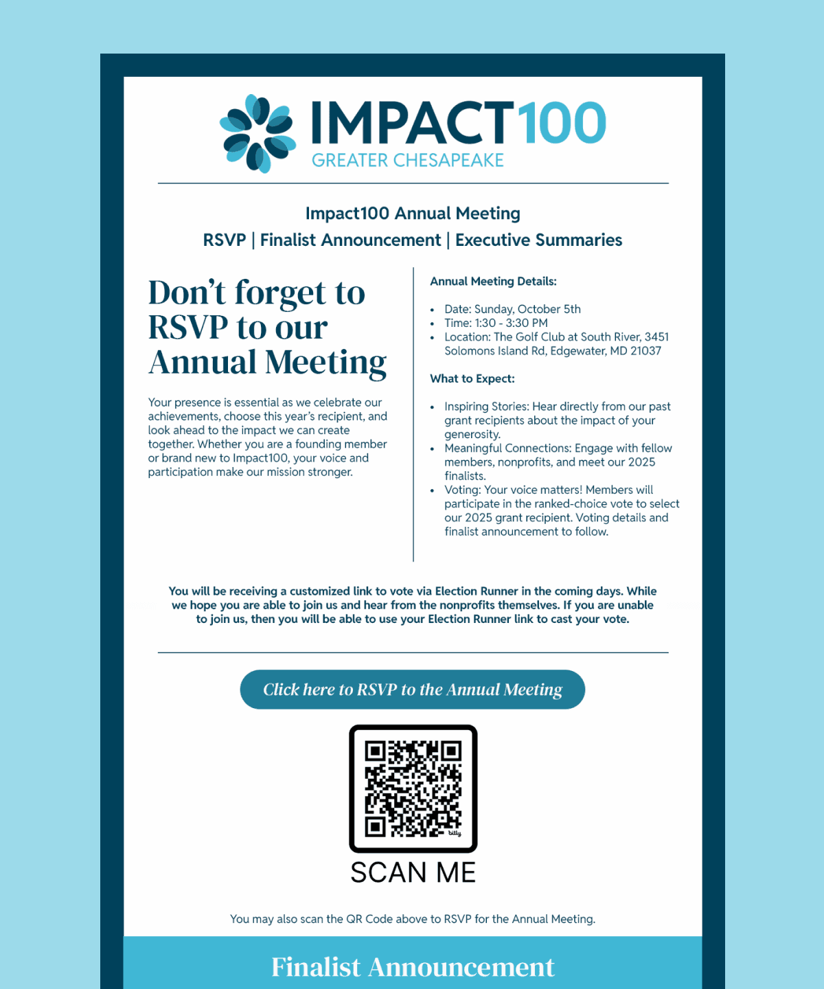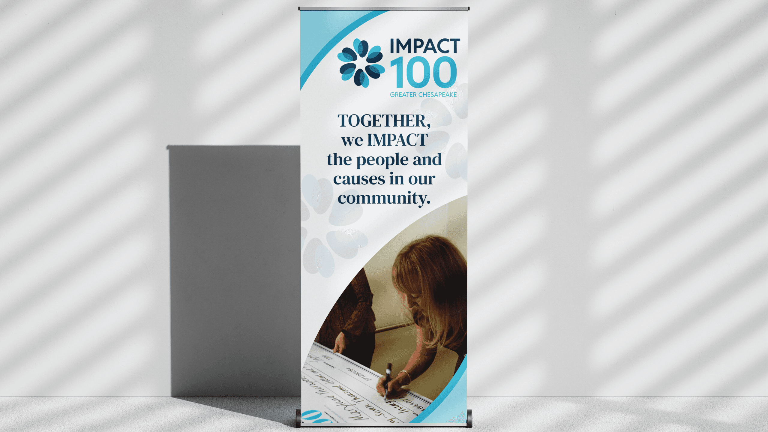 Brand identity refresh design for Impact100 Greater Chesapeake, to capture the dynamic aspect of what they accomplish, demonstrate their root of being a “giving-circle, and create a distinctive brand identity for Impact100 Greater Chesapeake while maintaining reference to the global company. The organization amplifies impact through collaboration, empowering members to make a meaningful difference.